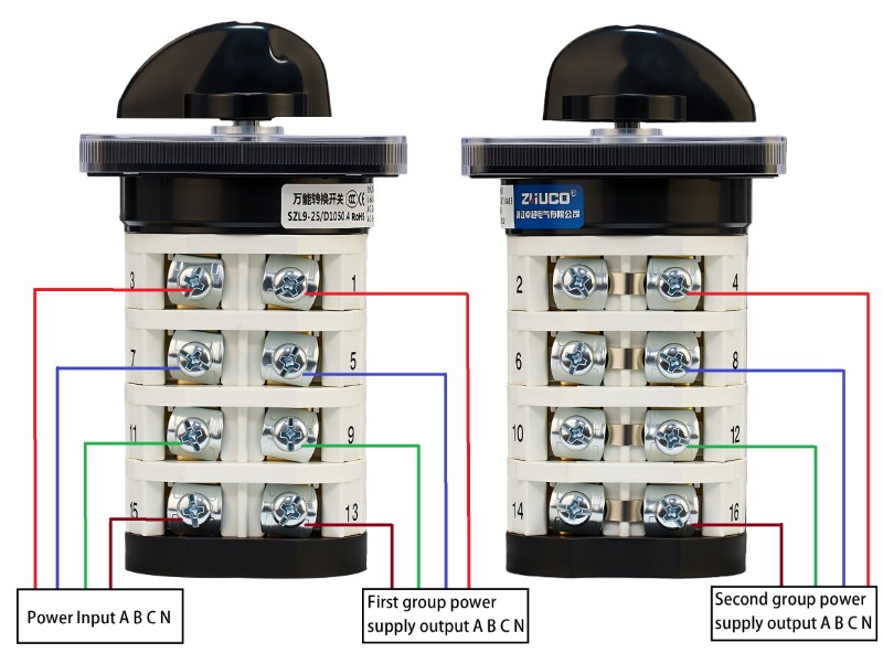 Function: Splits one power input into two power outputs for switching between two devices. When the handle is turned to position 1, the first group ABCN is energised; at position 2, the second group ABCN is energised; at the central 0 position, all connections are de-energised.