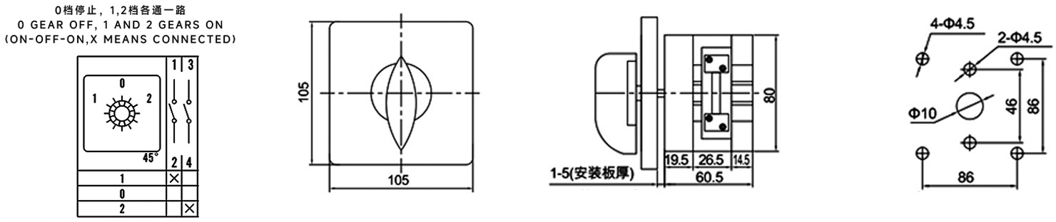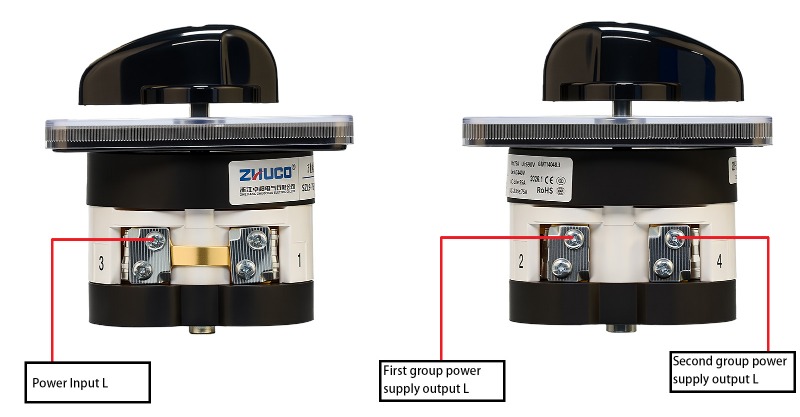Function: Splits one power input into two power outputs for switching between two devices. When the handle is turned to position 1, the first group L is energised; at position 2, the second group L is energised; at the central 0 position, all connections are de-energised.