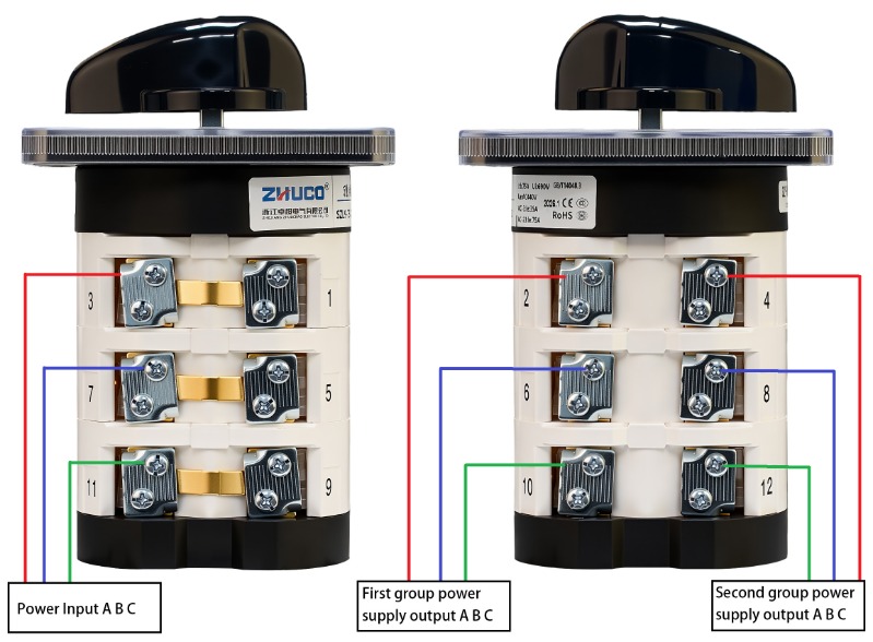 Function: Splits one power input into two power outputs for switching between two devices. When the handle is turned to position 1, the first set of ABC connections is energised; at position 2, the second set of ABC connections is energised; at the central 0 position, all connections are de-energised.